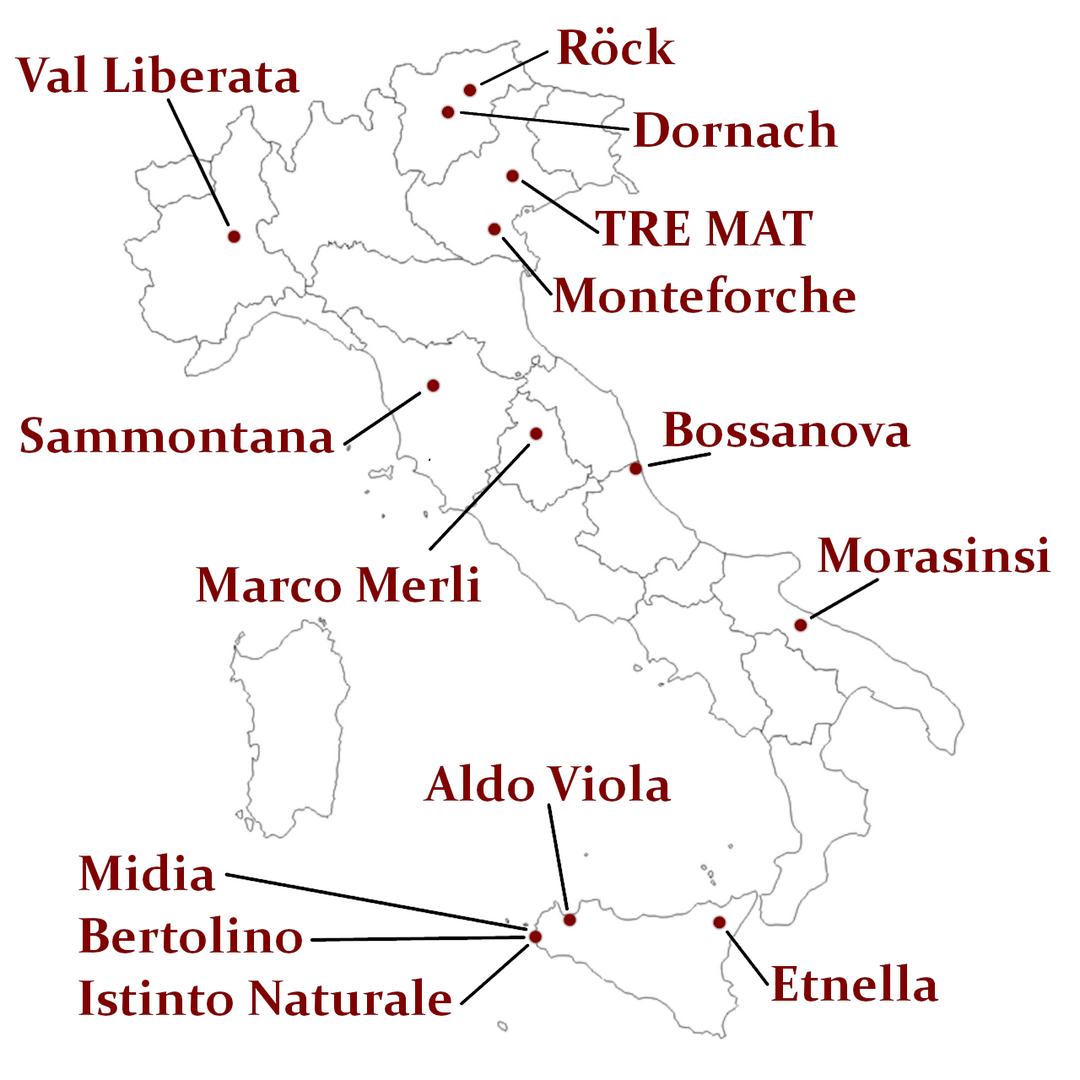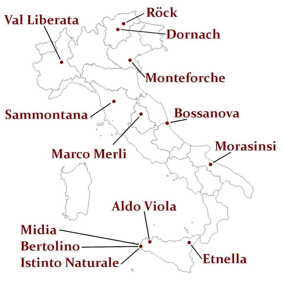 Seit 2018 reisen wir – Arne & Tom – regelmäßig durch Italien, um Naturweine zu entdecken, die uns wirklich berühren. Dabei geht es uns nicht nur um den Geschmack, sondern auch um die Menschen dahinter. Wir arbeiten inzwischen mit großartigen Winzerinnen und Winzern aus dem ganzen Land zusammen – von Südtirol bis Sizilien. Jede Flasche, die wir nach Berlin bringen und in ganz Deutschland vertreiben, erzählt eine Geschichte von Leidenschaft, Handwerk und Vertrauen. Wir kennen alle Produzent:innen persönlich, haben ihre Weinberge besucht – und aus der gemeinsamen Lust am Wein sind seither fantastische Beziehungen und Freundschaften gewachsen. Die Karte zeigt, wo unsere Weine herkommen – und wo unser Herz in Italien schlägt.